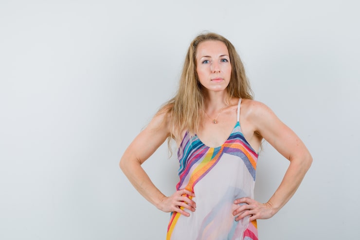 Гэби предпочитает платья с открытой линией плеч, и отсутствие волос ей совершенно не препятствует носить такую одежду. Будем меньше переживать из-за недостатков!