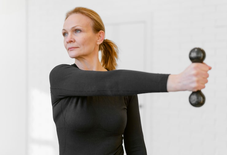 Помогает выровнять плечи и задействовать среднюю дельтовидную мышцу. Примите прямое положение, ноги расставьте на ширине тазовых костей, слегка согните колени. Возьмите гантели небольшого веса (от 1 до 5 кг). Выпрямите руки вдоль корпуса, зафиксируйте хват нейтральным способом. Поднимите руки в стороны, доводя их до уровня плеч, при этом слегка согните локти. Затем плавно опустите руки вниз, не позволяя мышцам полностью расслабиться. Выполняем 3–4 подхода — от 15 до 20 повторений.